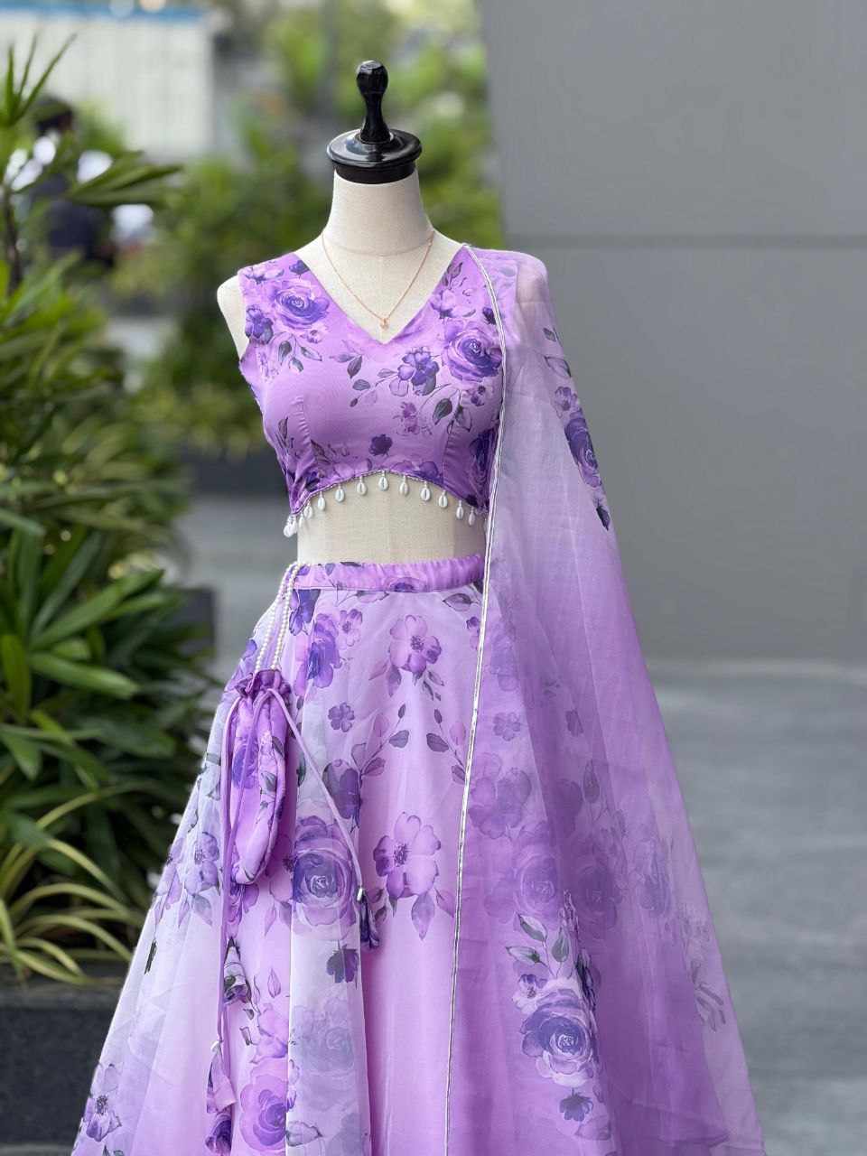 Lehenga – Pure organza silk digital printed lehenga with a grand 8-meter flair. Finished with canvas patta for a perfect flare